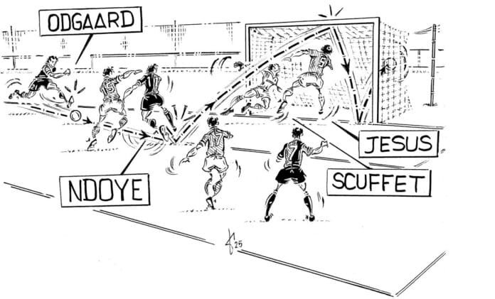 L’azione del gol: dalla sinistra Odgard, pennella un perfetto assist per l’attaccante svizzero. Con uno splendido colpo di tacco, colpisce la traversa. La palla scende sulla linea di porta ed entra in rete.