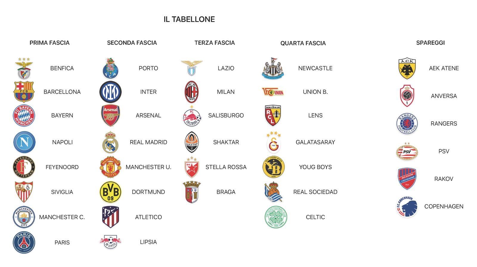 L’attesa ĆØ ormai quasi finita. Domani, giovedƬ 31 agosto, ore 18, inizia ufficialmente la Champions League 2023-2024 con il sorteggio della fase a gironi al Grimaldi Forum di Montecarlo. Quattro italiane SSC Napoli, SS Lazio, Inter FC (vice campione d’Europa) e AC Milan.